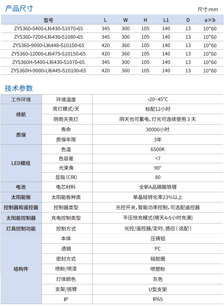 燈具內(nèi)置全新磷酸鐵鋰電池,配備獨(dú)立太陽(yáng)能電池板、遙控器和安裝配件。