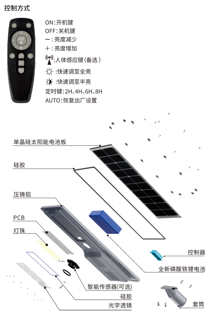 這款太陽能路燈實現(xiàn)了磷酸鐵鋰電池、太陽能板與控制器的完美集成,安裝時只需將燈具固定在燈柱上,讓發(fā)光面精準朝向待照明的路面,同時將太陽能板對準太陽即可。值得一提的是,如路燈搭載微波運動傳感器,能更有效延長電池的使用壽命,可進一步提升了路燈的實用性和經(jīng)濟性。